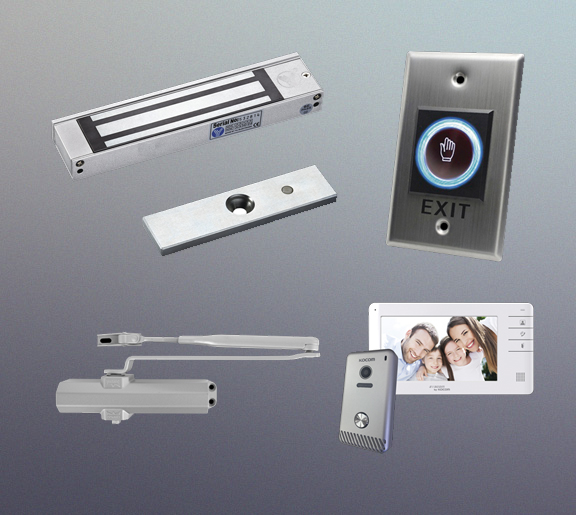 En esta imagen le mostramos algunos de los varios complementos para hacer la solición completa, Chapas metálicas, cierra puertras, para puertas de metal, cristal madera etc, varios modelos de videoporteros con interfón, boton de salida para instalar dentro del fraccionamiento o en la caseta para apertura de visitantes a pie, contamos con muchos productos más, contacte con nosotros para realizar una propuesta a su medida.